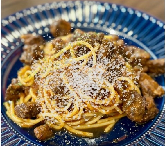 じっくり煮込んだ牛すね肉のパスタに粉雪をイメージして粉チーズいっぱいかかったパスタにしました⛄