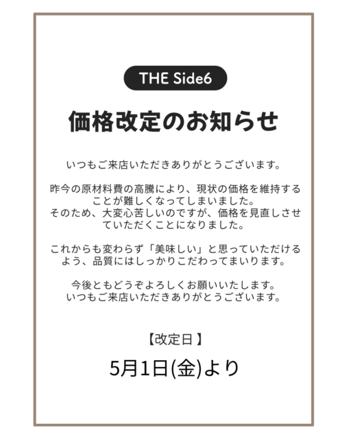 原材料費高騰のため、誠に勝手ながら価格を改定させていただきます。